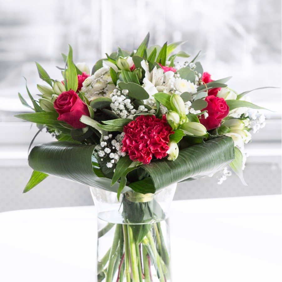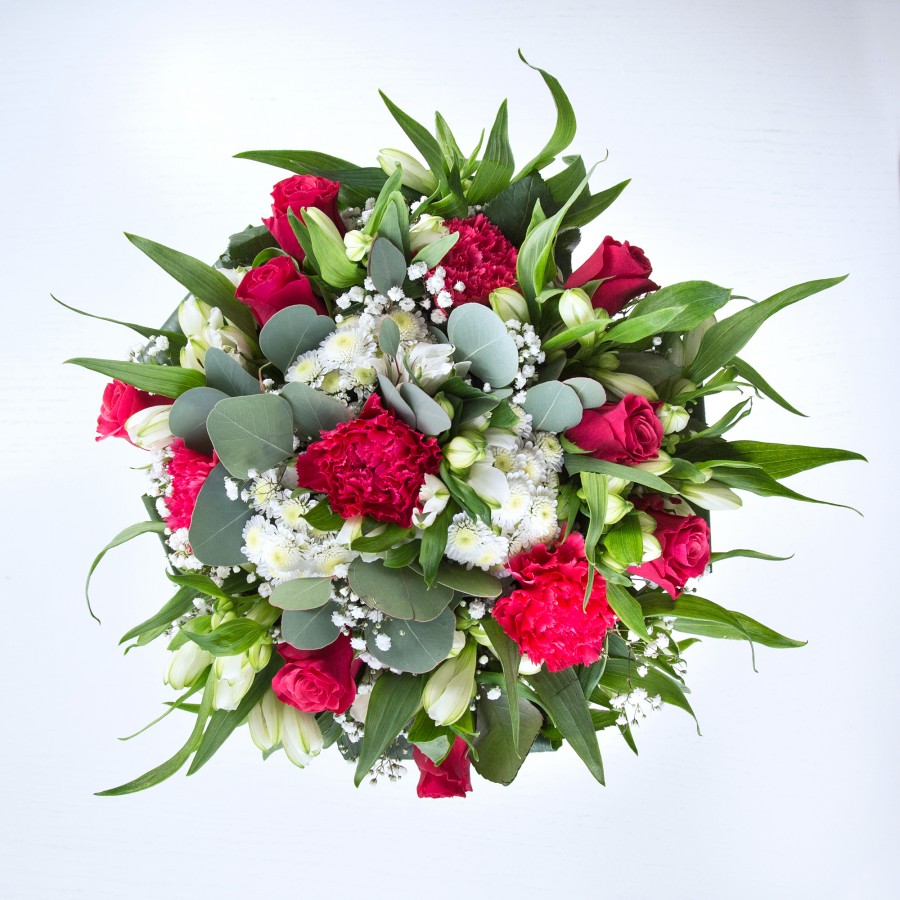 Embrace the elegance and charm of our red and white bouquet collection. Featuring deep red roses and delicate white chrysanthemums, this arrangement is beautifully intertwined with soft gypsophila and vibrant carnations. Accented by white alstroemeria and lush aspidistra leaves, every flower is hand-selected to ensure exceptional freshness.